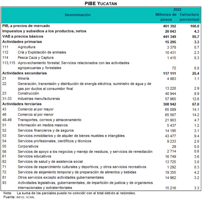 En 2022, la economía de Yucatán presentó un Producto Interno Bruto (PIB) nominal de 461 392 millones de pesos. Las actividades primarias participaron en el producto total de la entidad con 3.3 %; las secundarias con 25.4 %; las terciarias con 67.0 %, y los impuestos y subsidios a los productos, netos con 4.3 % (ver cuadro 1).
