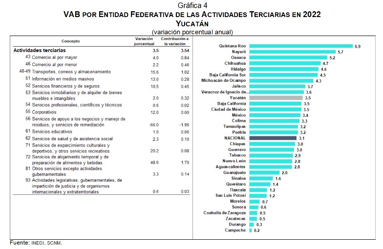 En Yucatán el VAB de las actividades terciarias creció 3.5 % por el incremento en Comercio al por mayor (4.0 %), Comercio al por menor (2.2 %), Transportes correos y almacenamiento (15.6 %) y en Servicios de alojamiento temporal y de preparación de alimentos y bebidas (48.6 %). El sector Servicios de apoyo a los negocios y manejo de residuos, y servicios de remediación disminuyó 66.0 por ciento. Para estas actividades, la entidad observó un crecimiento mayor al registrado a nivel nacional (ver gráfica 4).