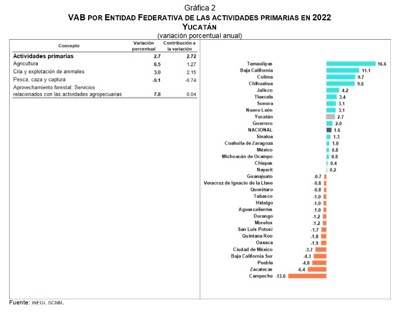 Las actividades primarias en Yucatán aumentaron 2.7 %, por el crecimiento en Agricultura de 6.5 %, y Cría y explotación de animales 3.0 por ciento. Para estas actividades la entidad observó un incremento mayor al registrado a nivel nacional (ver gráfica 2).