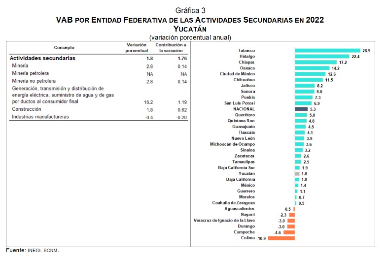 Las actividades secundarias en Yucatán aumentaron 1.8 por ciento. Lo anterior se debió, principalmente, a los crecimientos de 16.2 % en la Generación, transmisión, distribución y comercialización de energía eléctrica, suministro de agua y de gas natural por ductos al consumidor final y 1.8 % en el sector Construcción. Para estas actividades la entidad observó un incremento inferior al registrado a nivel nacional (ver gráfica 3).