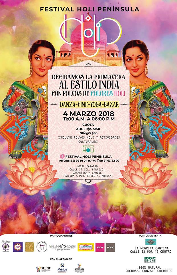 El domingo 4 de marzo se realizará el gran cierre de talleres con una presentación de danzas, actividades para niños (as) como yoga y danza Bollywood, cuenta cuentos de India, presentación de danza y yoga con los maestros y participantes en los talleres y al final tendremos la esperada Batalla con polvos de colores y música, en la quinta Paraíso, ubicada en Calle 37, Col. Paraíso, entrada a Cholul, e 11 am a 6 pm.