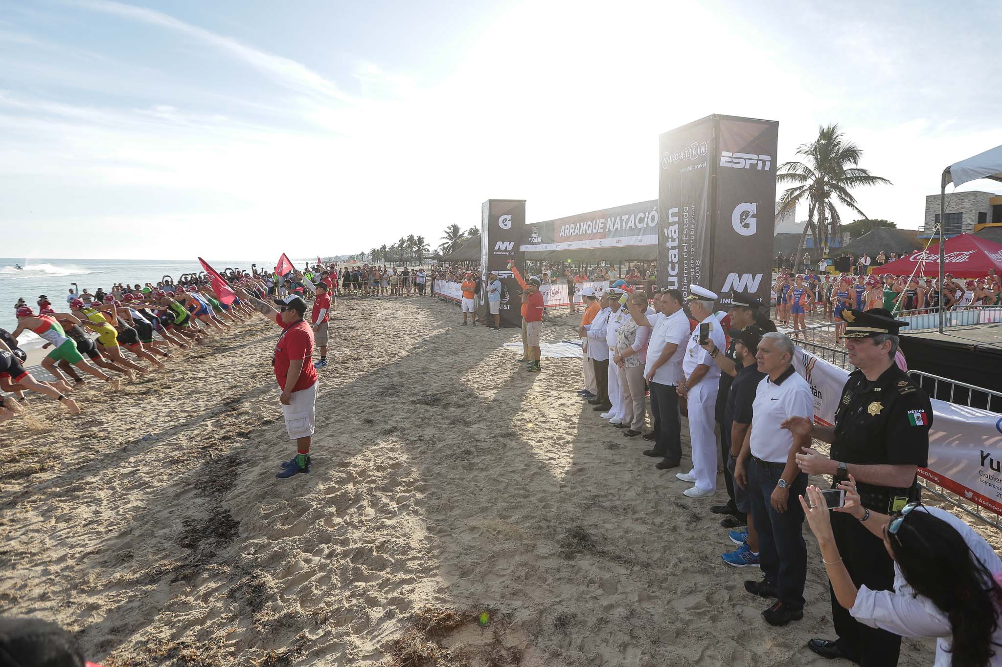 Desde muy temprana hora, competidores y sus acompañantes, así como amantes de esta contienda, abarrotaron el malecón de Progreso, donde el Gobernador Rolando Zapata Bello hizo sonar la corneta que puso en marcha la quinta edición de esta exigente justa, conformada por las especialidades de nado, ciclismo y carrera a pie.